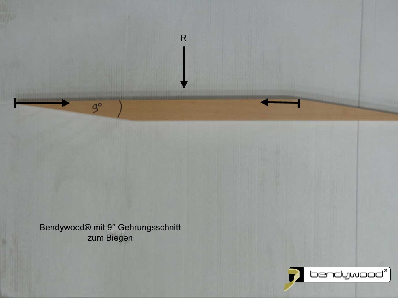 Wie den Zuschnitt auf die genaue Länge kalkulieren:Bendywood das gebogen wird, staucht sich an der Innenseite und dehnt sich an der Außenseite: nur die Mittellinie hält die ursprüngliche Länge und das muss beim Längenzuschnitt berücksichtigt werden.