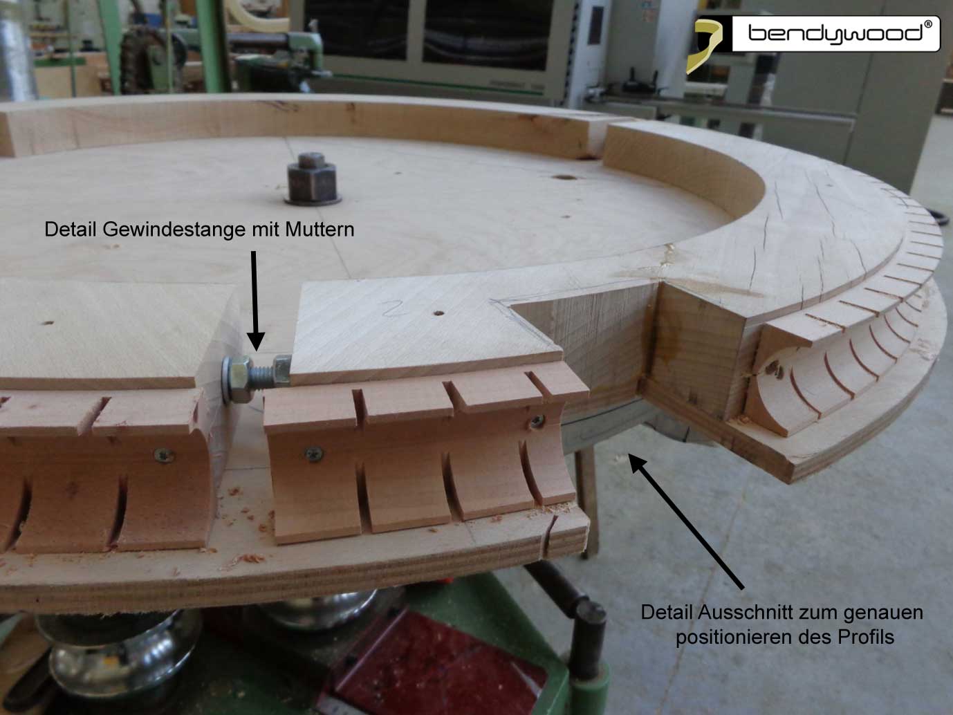 R = 50 cm. - Das Profil zusammen mit dem Negativprofil gegen die Schablone biegen, mit Zwingen andrücken, die Gehrungsflächen in Position drehen und verleimen. Zuvor die Negativprofile an der Leimstelle mit Klebstreifen abdecken. Falls notwendig, die Biegeschablone mittels der Muttern an den Gewindestangen nachjustieren, damit die Profilenden passend verleimt werden können.