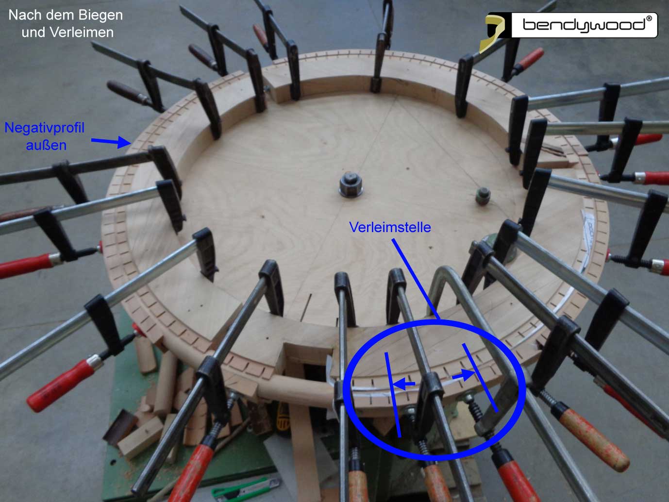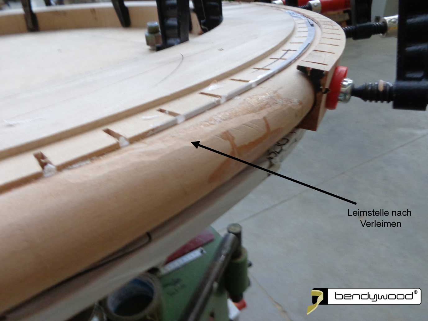 - Nach dem Aushärten des Leims den Ring der Schablone entnehmen und die Leimstelle sauber schleifen.