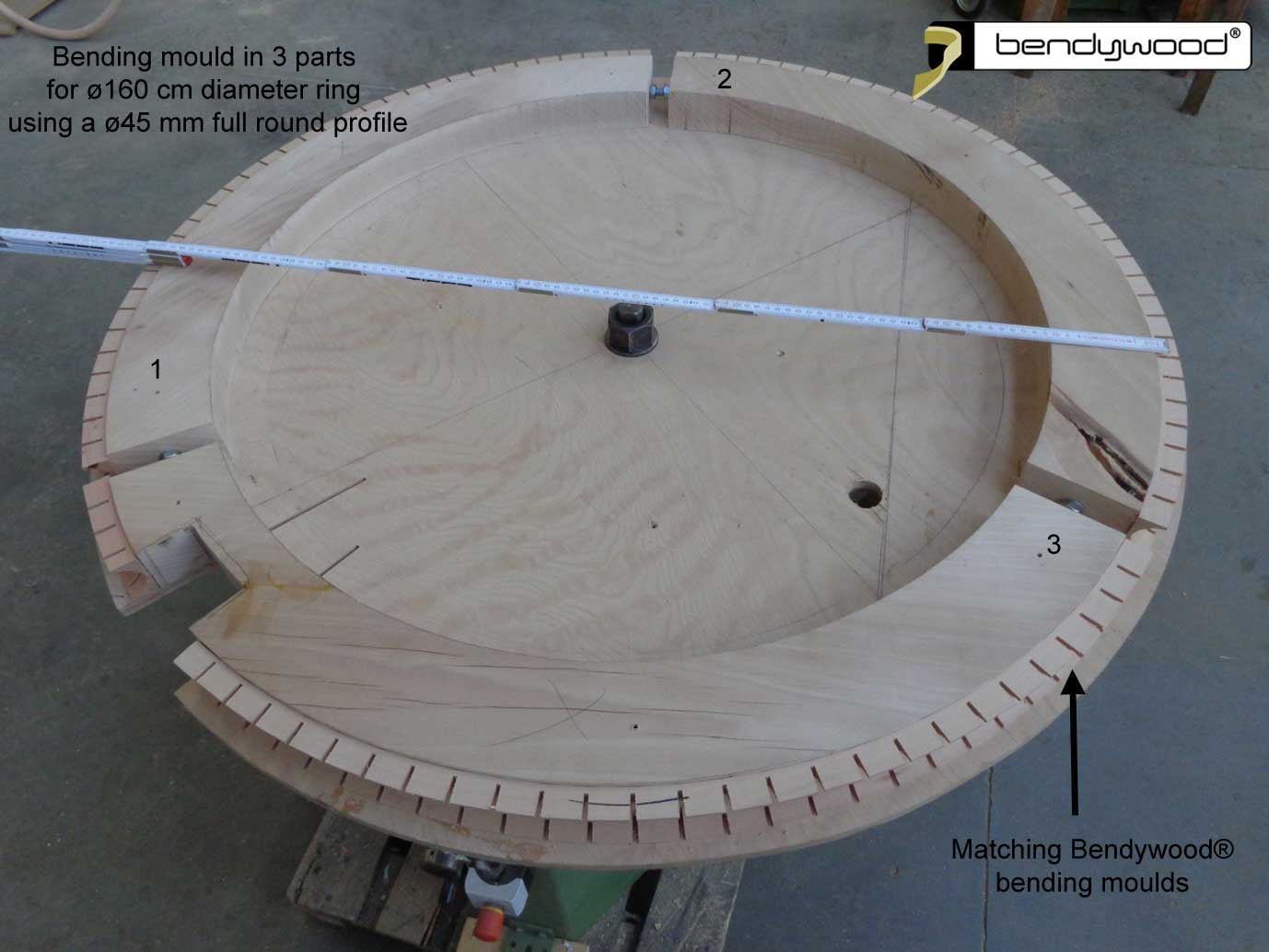 - Build a bending mould in 3 parts (see photo) with radius 80 cm. Put the 3 parts together using threaded bolts, nuts and washers.
