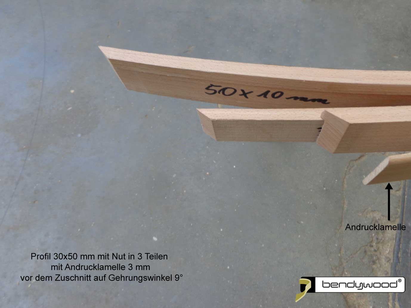 - Fräsen der 3 Lamellen von je 10 mm Stärke aus Bendywood®-Rechteckleisten (wie auf Seiten 11 und 12 der Preisliste) oder als fertigen Lamellen-Satz bestellen.