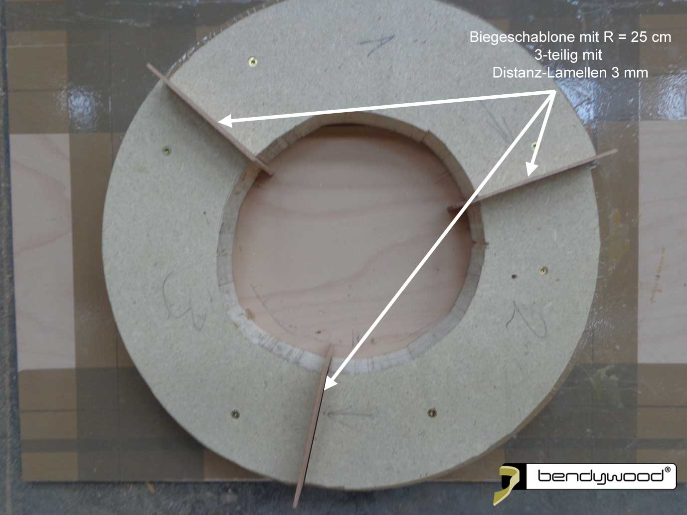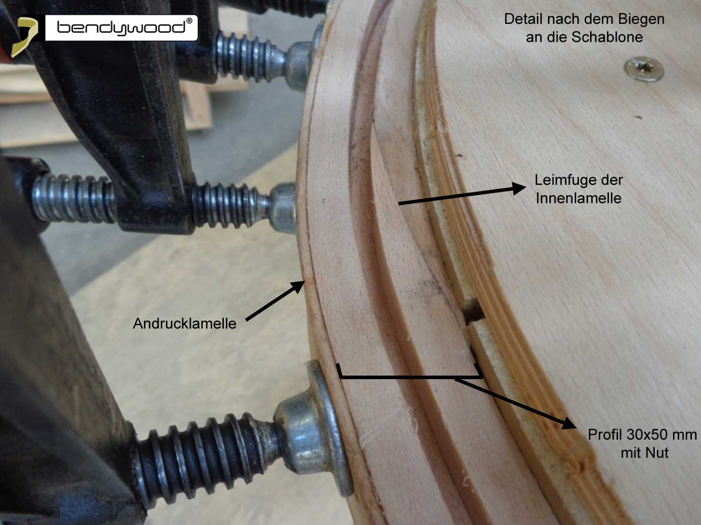 - Anfertigen einer 3-teiligen Biegeschablone mit R = 25 cm und eines Sperrholzrings. Als Leimschutz die Außenkante der Schablone mit einem Klebeband abdecken. Eine Bendywood-Andrucklamelle von ca. 3x40 mm bereitstellen: als Schutz der Außenseite des Rings beim Festklemmen des gebogenen Profil-Pakets an die Schablone.