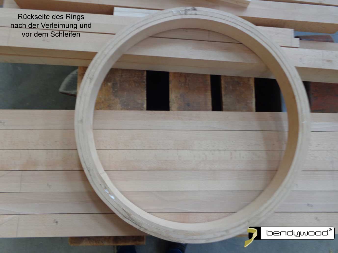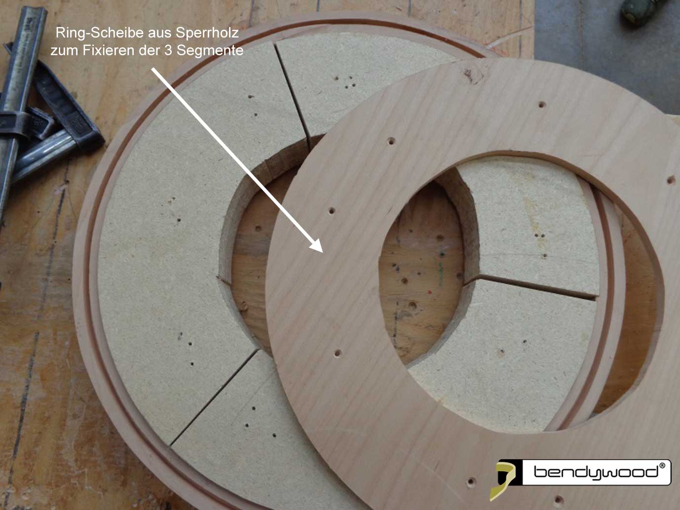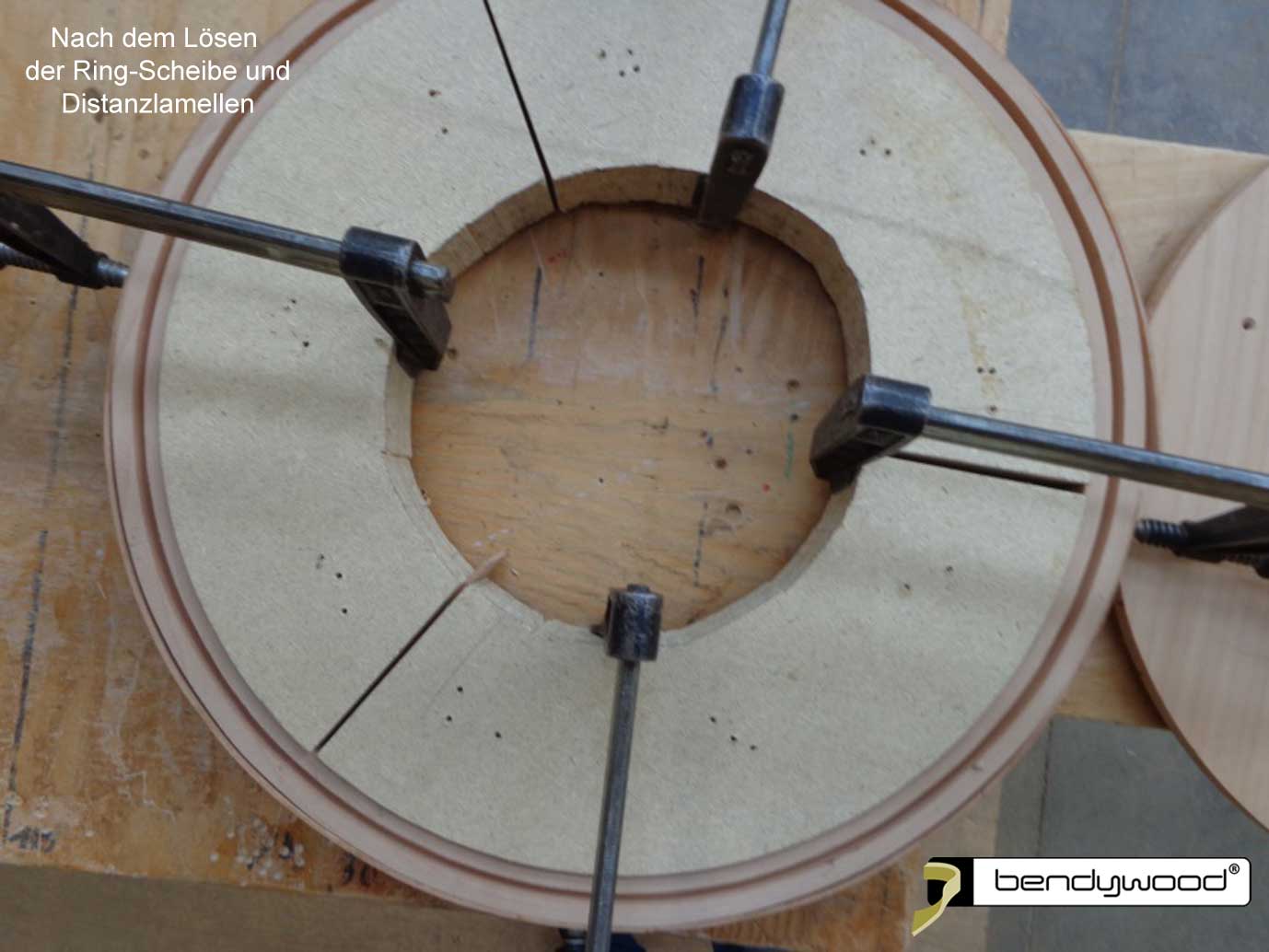 - Die 3-teilige Schablone sollte unmittelbar danach enger gestellt werden (durch Entnahme des Sperrholzrings und der Distanzlamellen), um nach dem Aushärten des Leims den verleimten Ring der Schablone entnehmen zu können. Ohne diese Lockerung könnte sich der Ring an der Schablone festklemmen, da Biegeholz während der Konsolidierung in einer gebogenen Form in der Länge schrumpft.