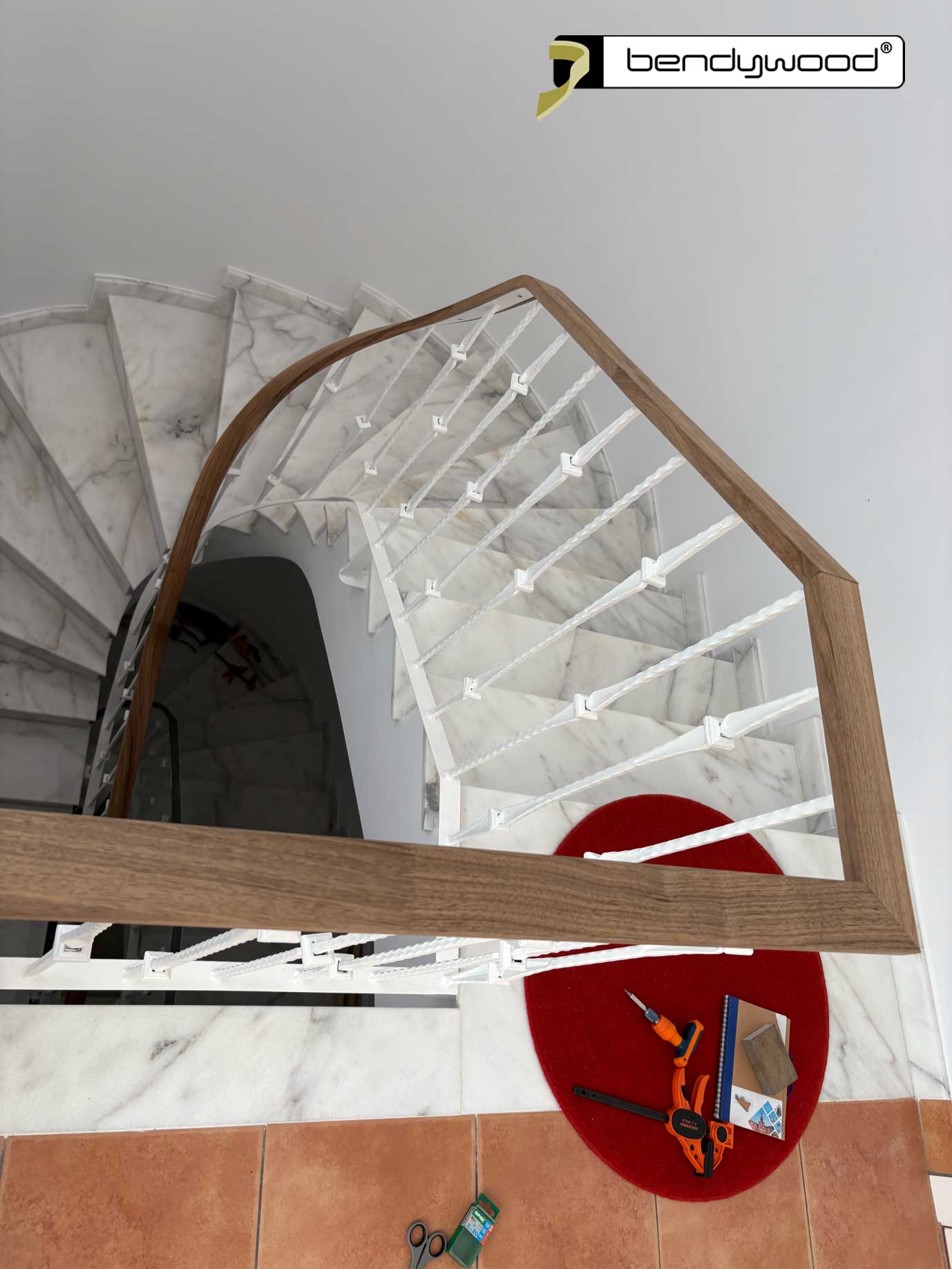 Spain is synonymous with bright colors, hence the delicately curved white wrought iron railing and, as a contrast, the dark walnut handrail.
