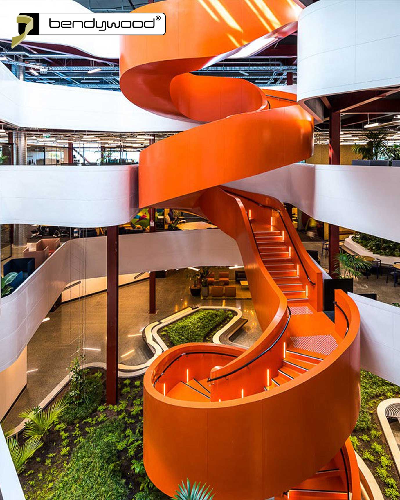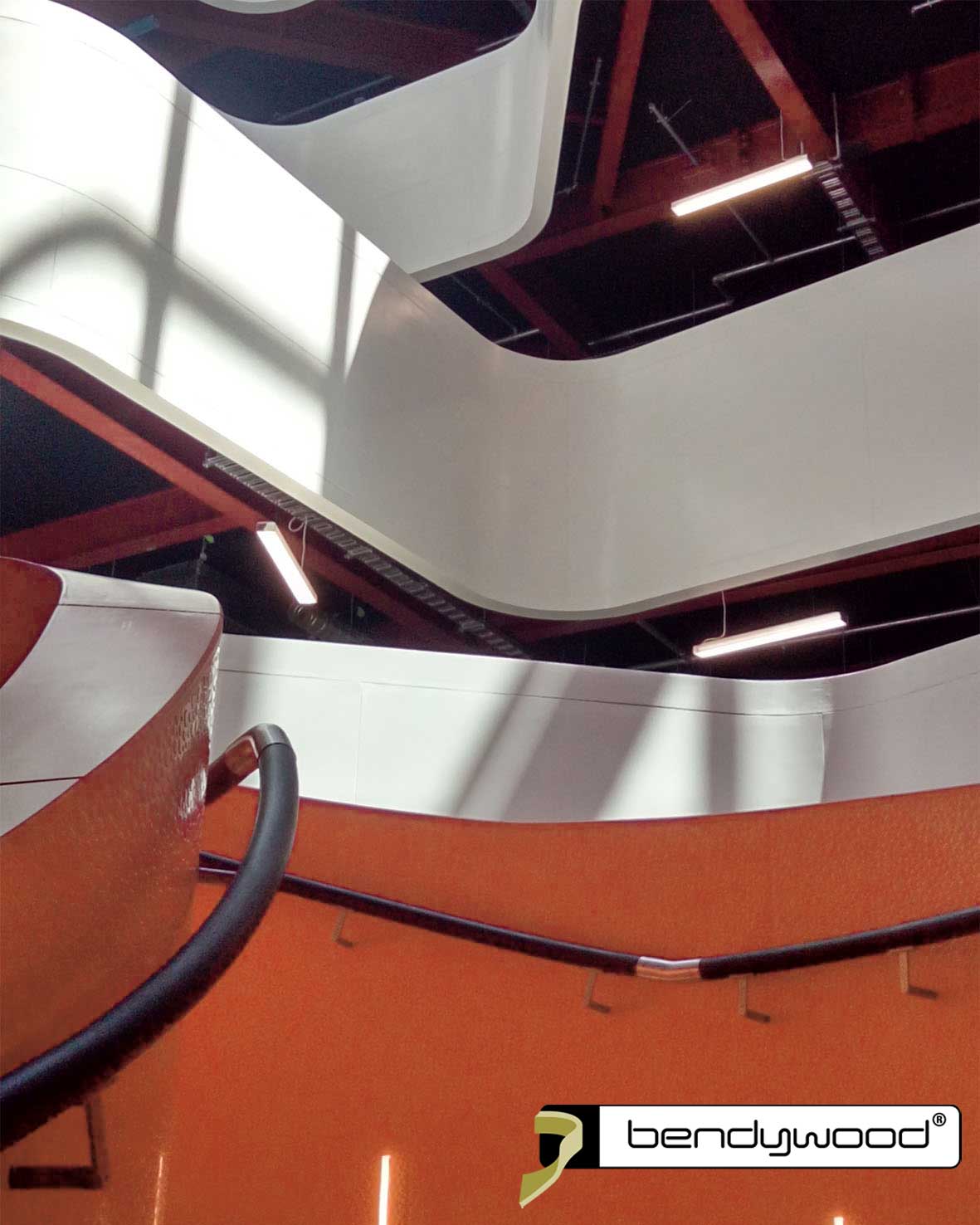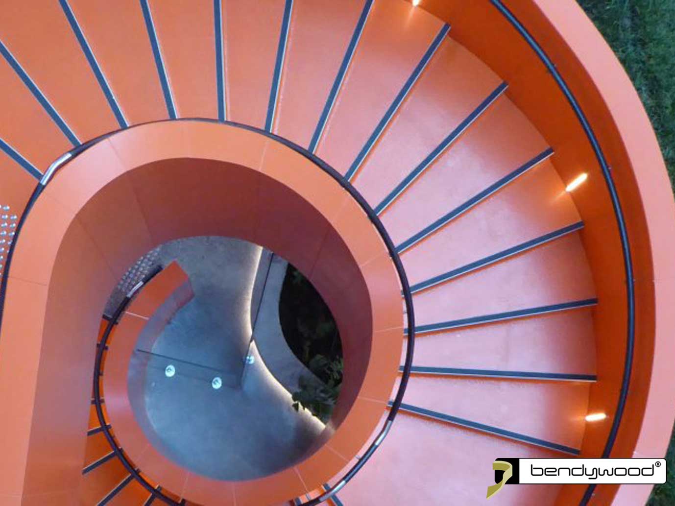 Thanks to the Bendywood® bending handrails and the stainless steel sleeve system for the joints a clean, seamless aesthetic, free of glue lines, could be created. The black finish of the handrails also highlights the natural beauty of the timber.