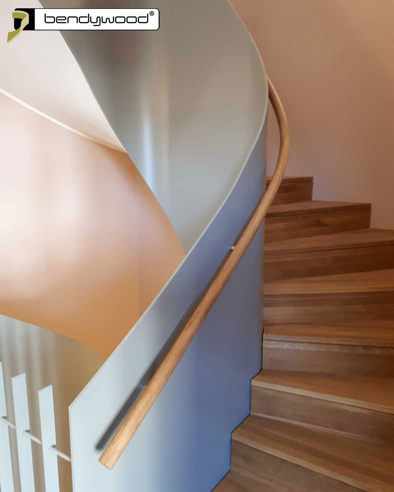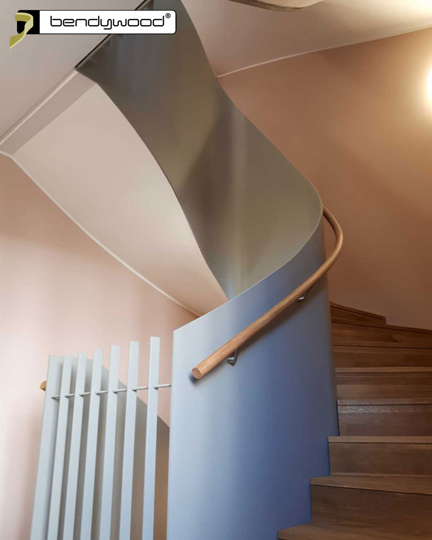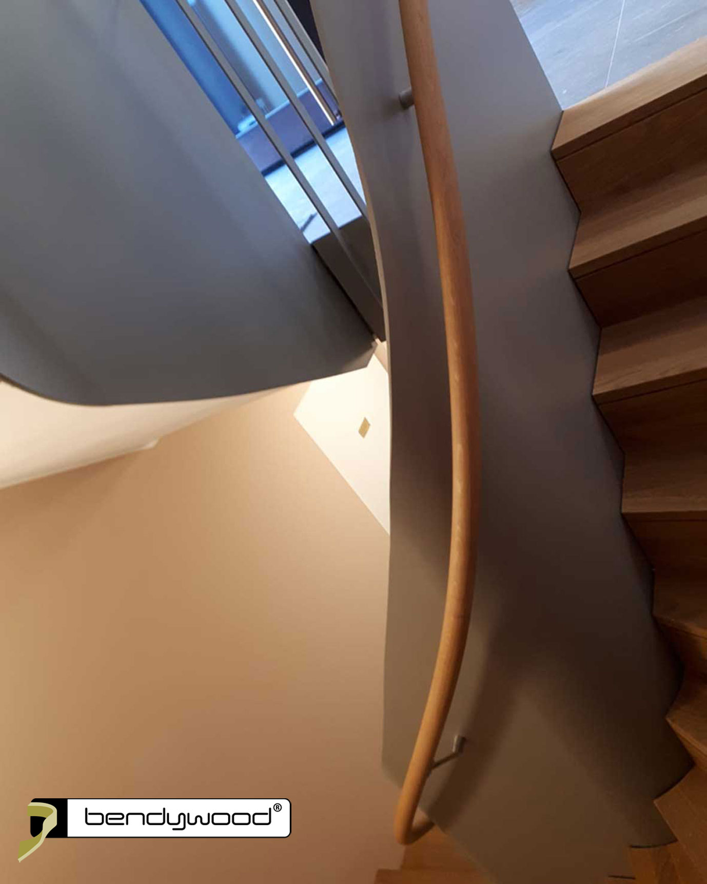 Round bending handrails in Bendywood®-oak ø42 mm, single lengths of 4,8 m ; diagonal jointedFitted on a 10 mm thick steel plate stair railing