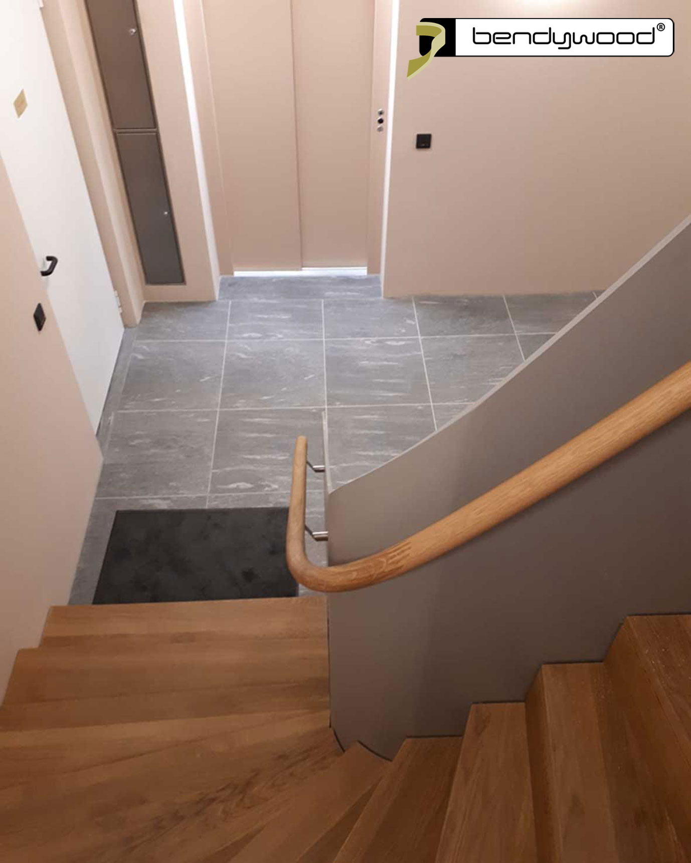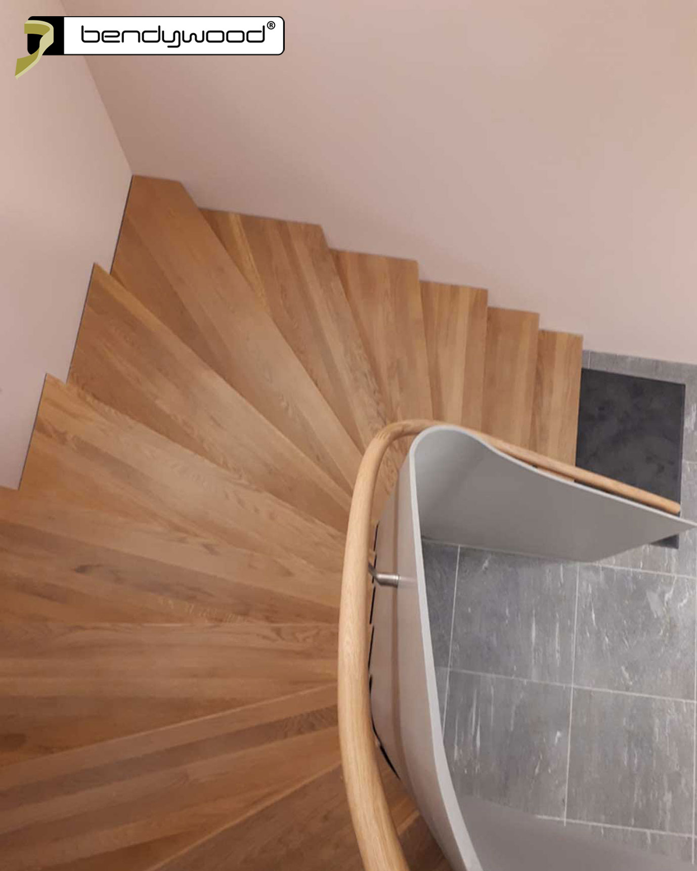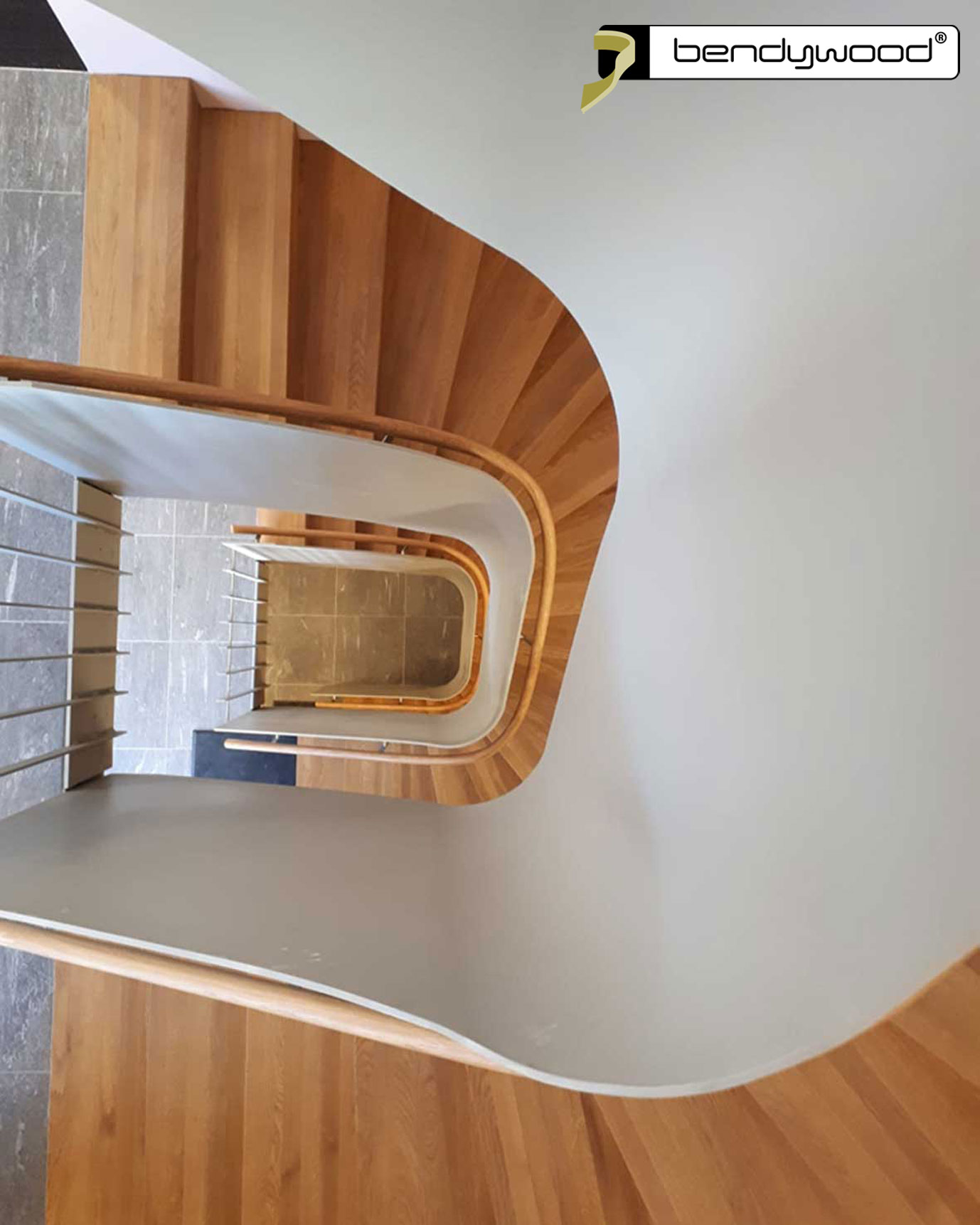 Round bending handrails in Bendywood®-oak ø42 mm, single lengths of 4,8 m ; diagonal jointedFitted on a 10 mm thick steel plate stair railing