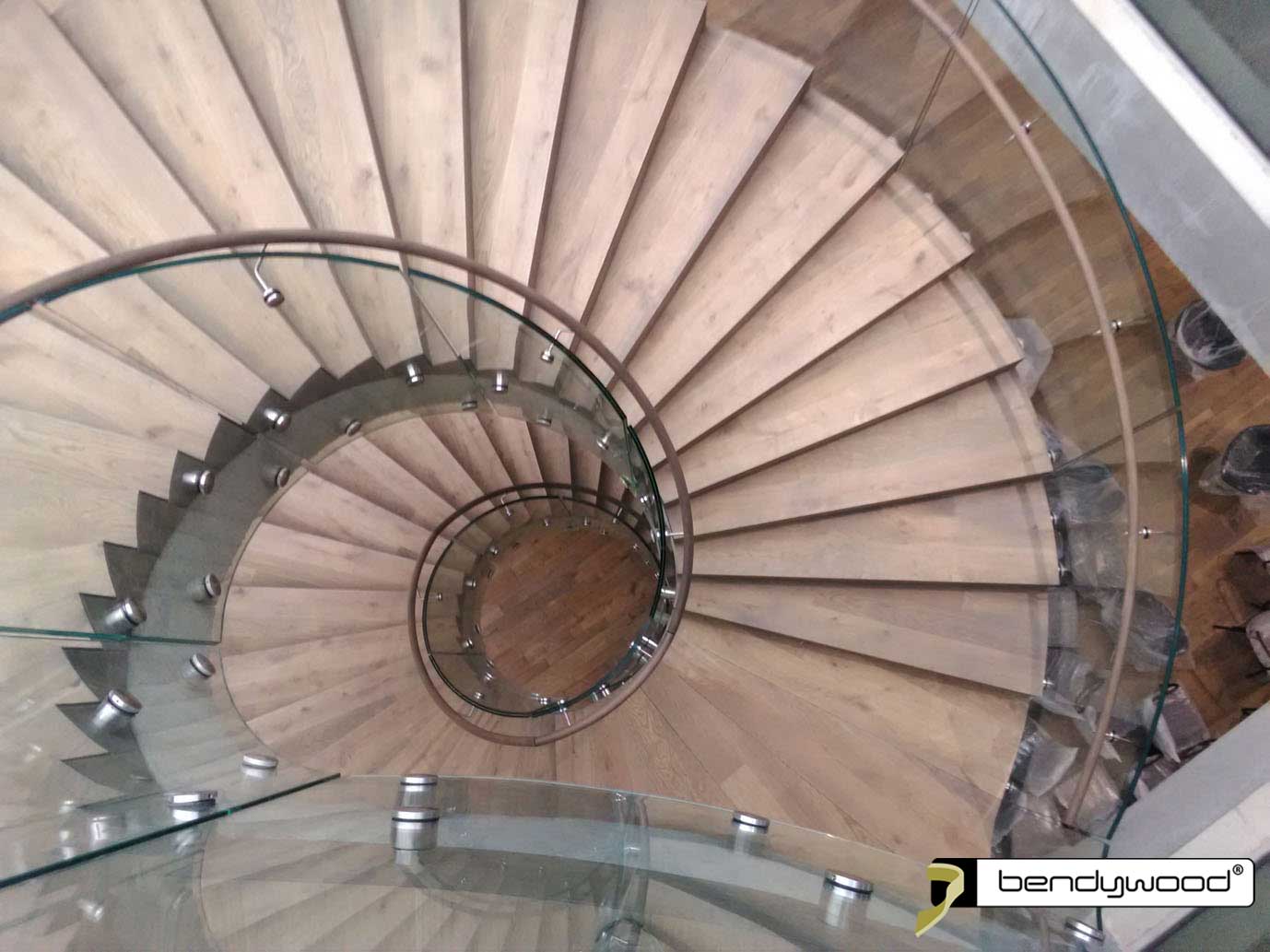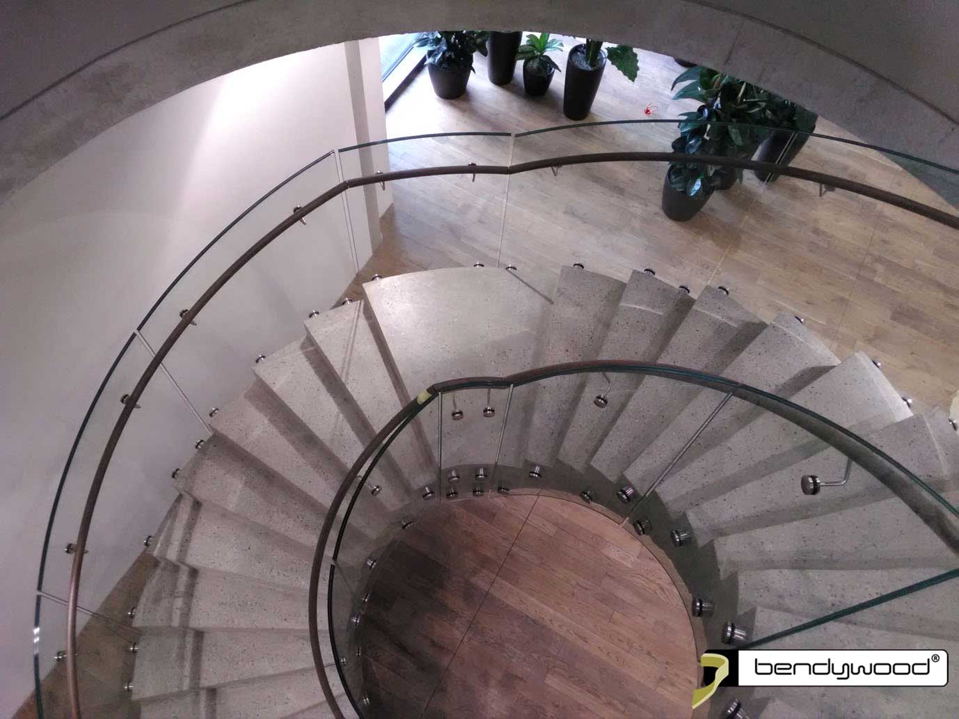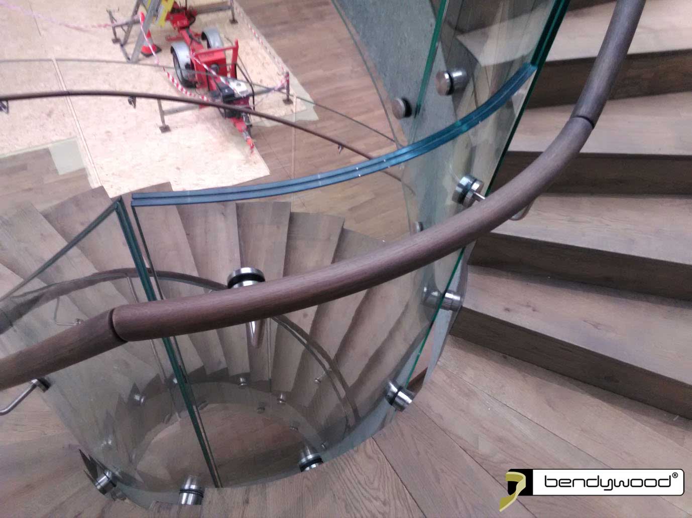 Bendywood® oak ø40 mm handrails with diagonal joints for spiral stairs on brackets of glass railing