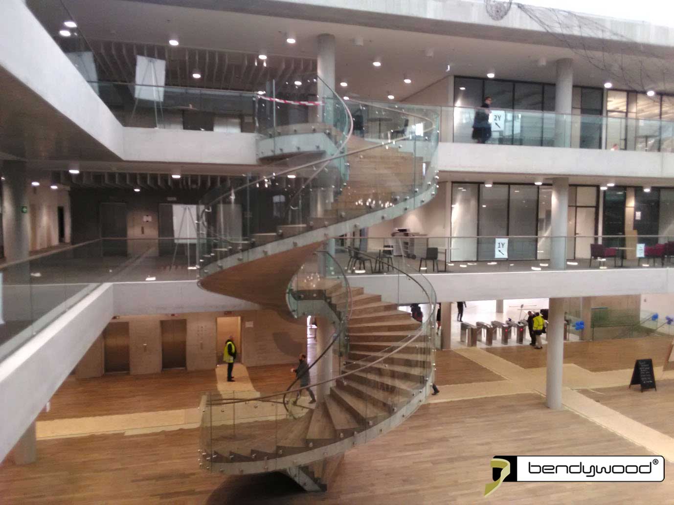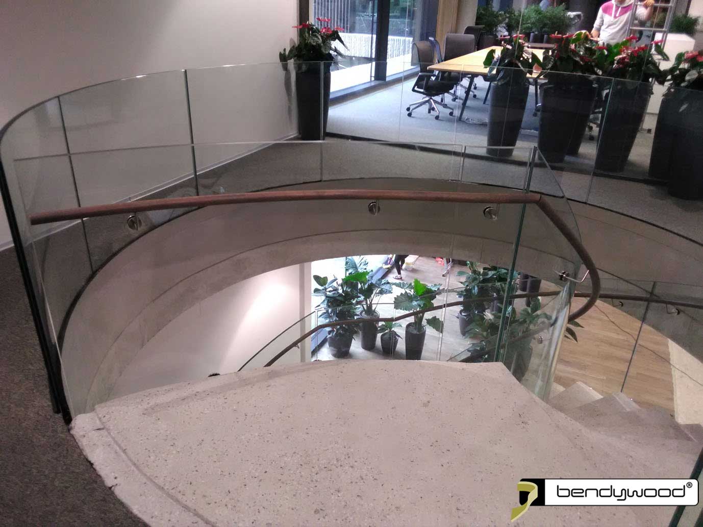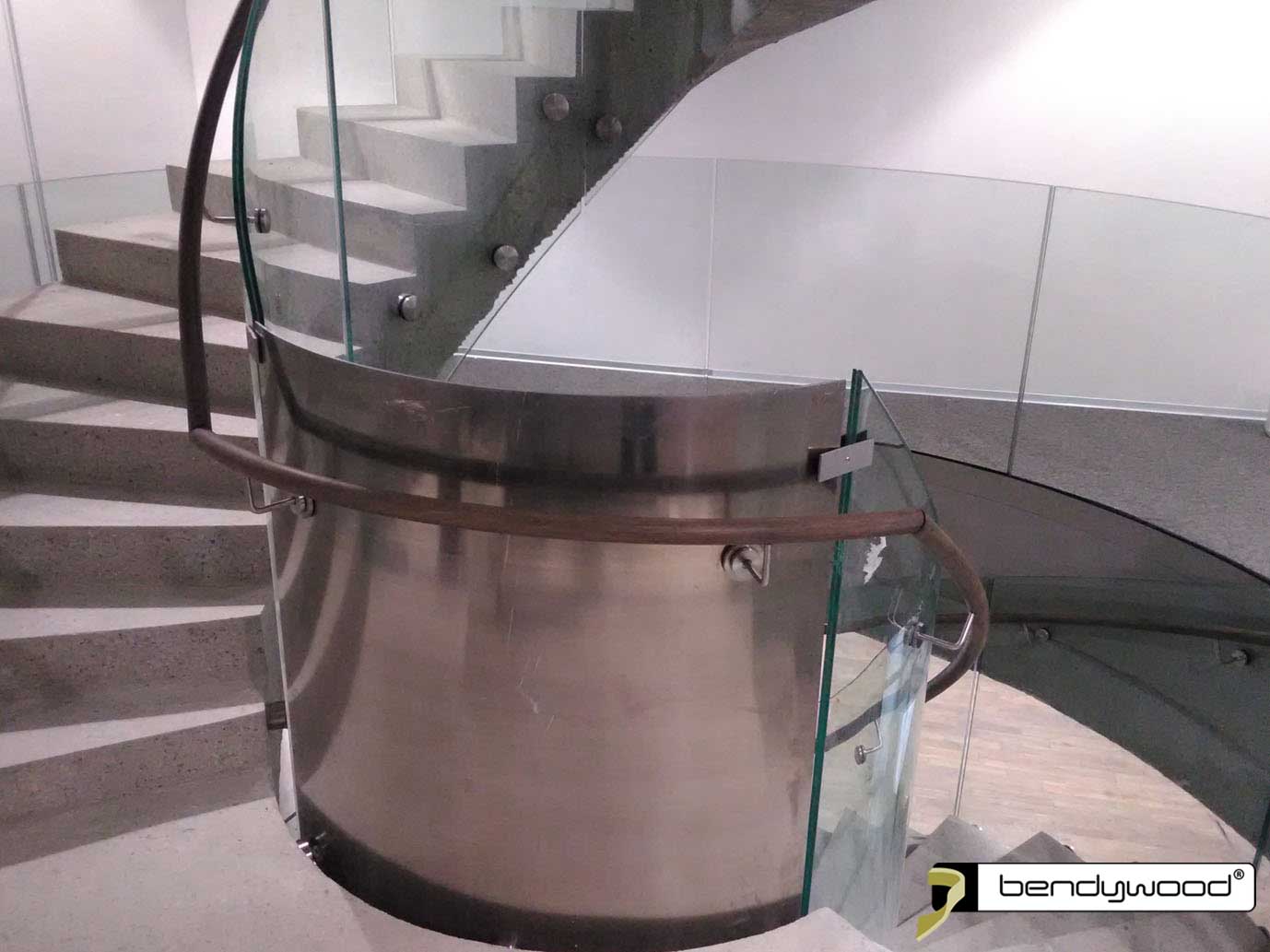 Bendywood® oak ø40 mm handrails with diagonal joints for spiral stairs on brackets of glass railing