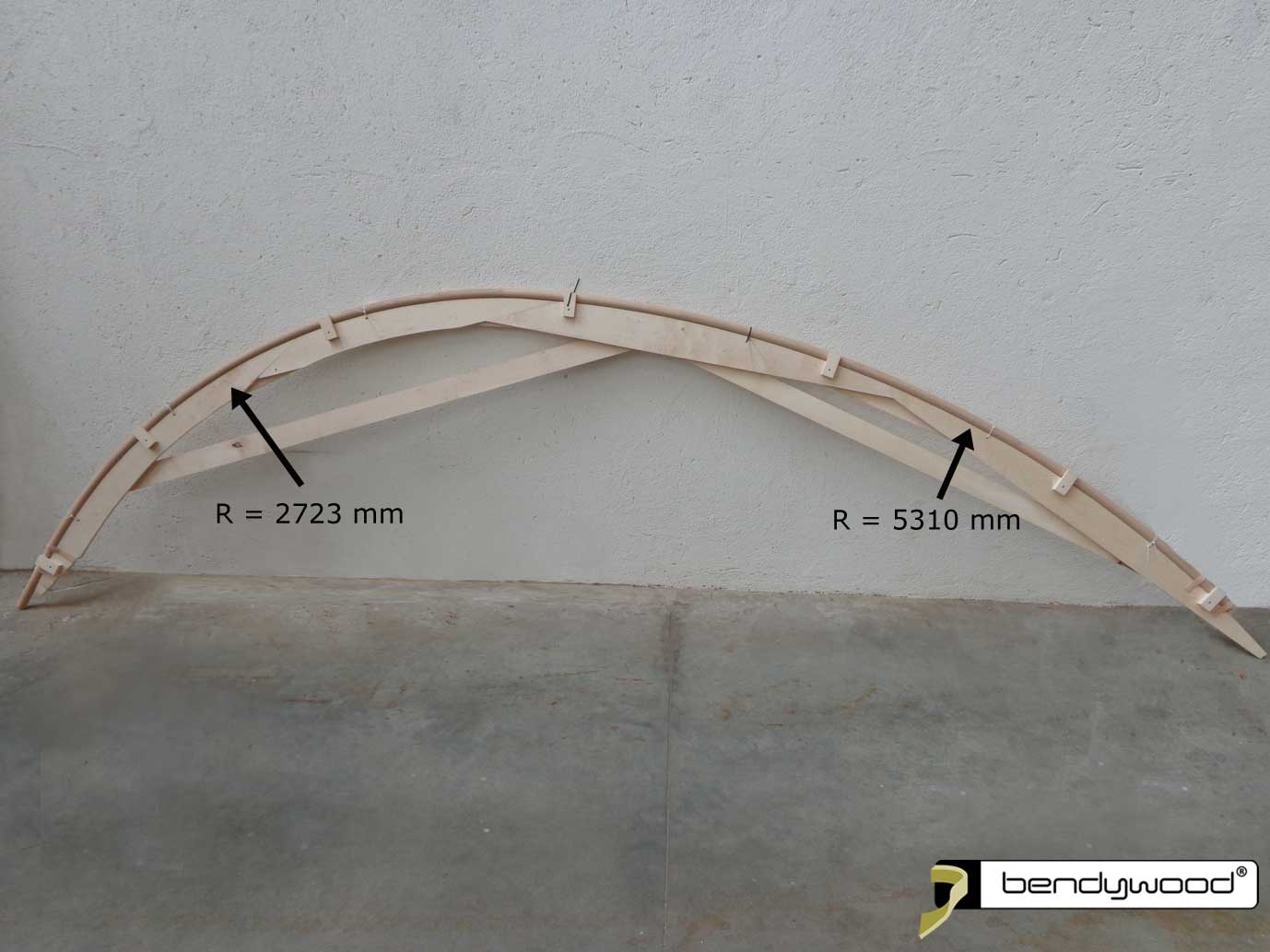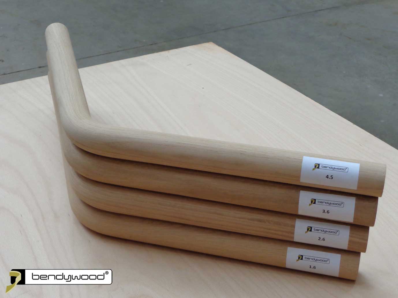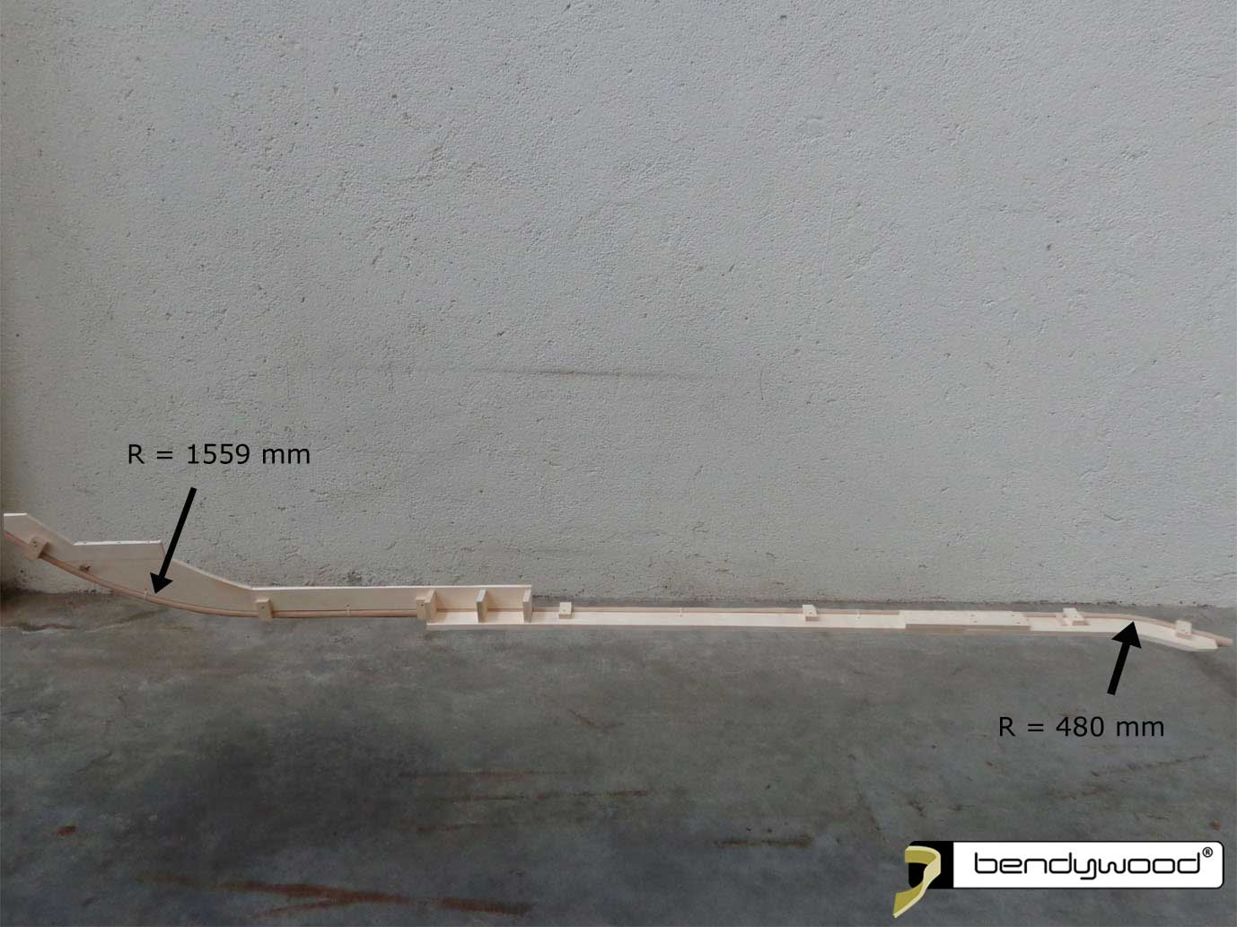 The handrails were pre-bent in the workshop as per customer’s drawing and fixed to 13 individual moulds, ready to be mounted. The bending radii were kept about 30% tighter than those indicated, as the bent parts slightly open up again when they are taken from the mould: Spring-back after being taken from the moulds (bendywood.com)