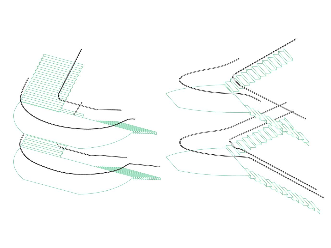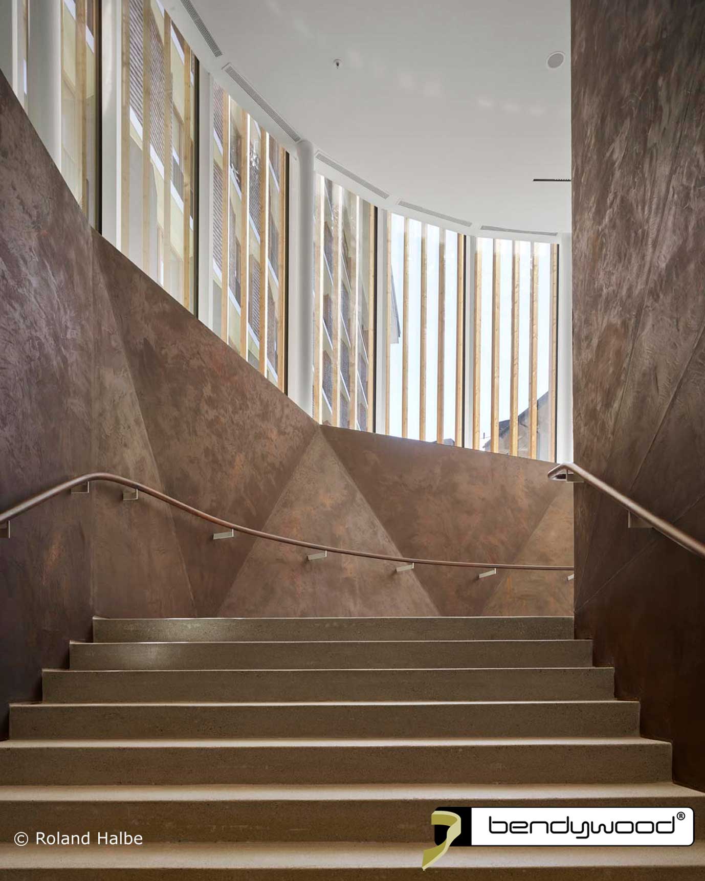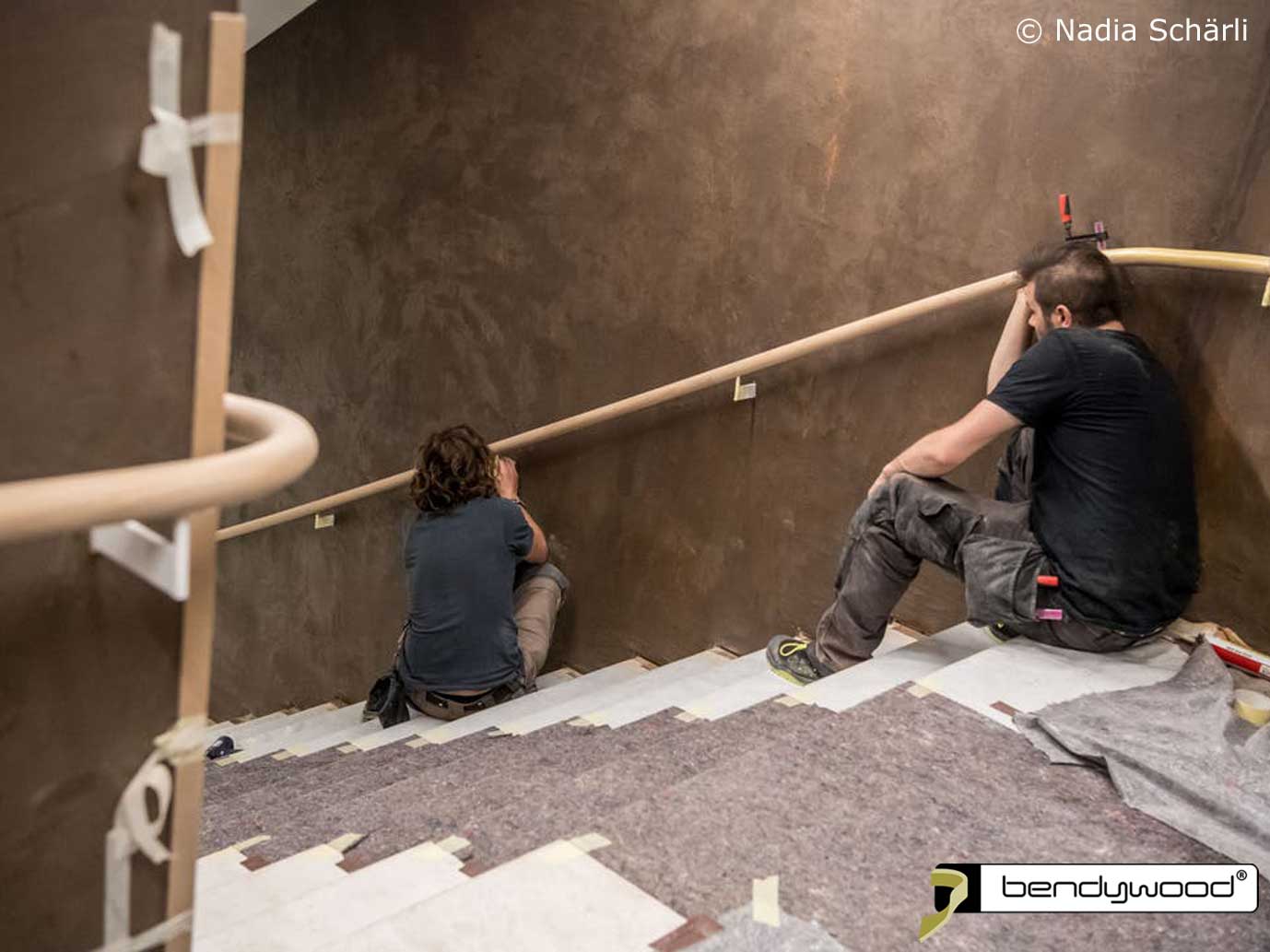 The handrails were pre-bent in the workshop as per customer’s drawing and fixed to 13 individual moulds, ready to be mounted. The bending radii were kept about 30% tighter than those indicated, as the bent parts slightly open up again when they are taken from the mould: Spring-back after being taken from the moulds (bendywood.com)