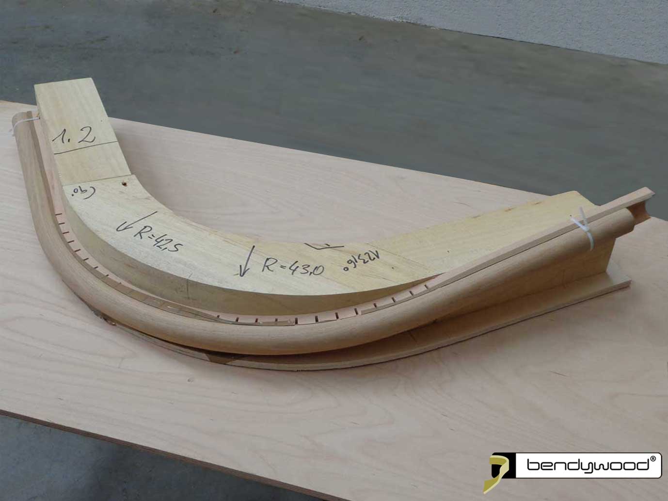 The connection parts were bent using 3 to 8 mm thick lamellas that were cut out of one and the same block of Bendywood®. As a result of that the bent parts are uniform in colour and grain, identical to parts in solid wood.