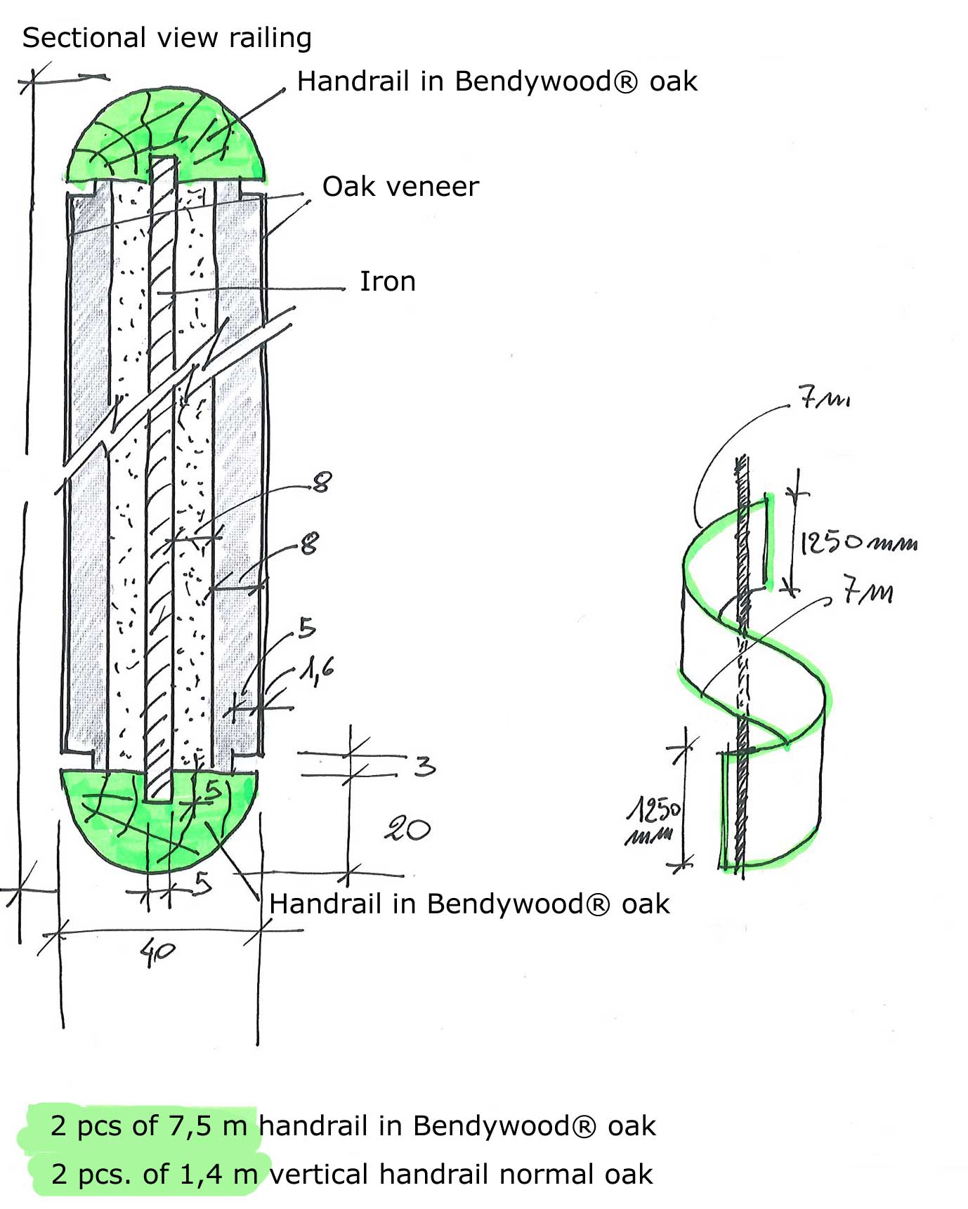 The handrail was pre-bent in the factory around a flat mould with R 100 cm, then divided horizontally in half and finally fixed on a transport mould and shipped to the construction site.